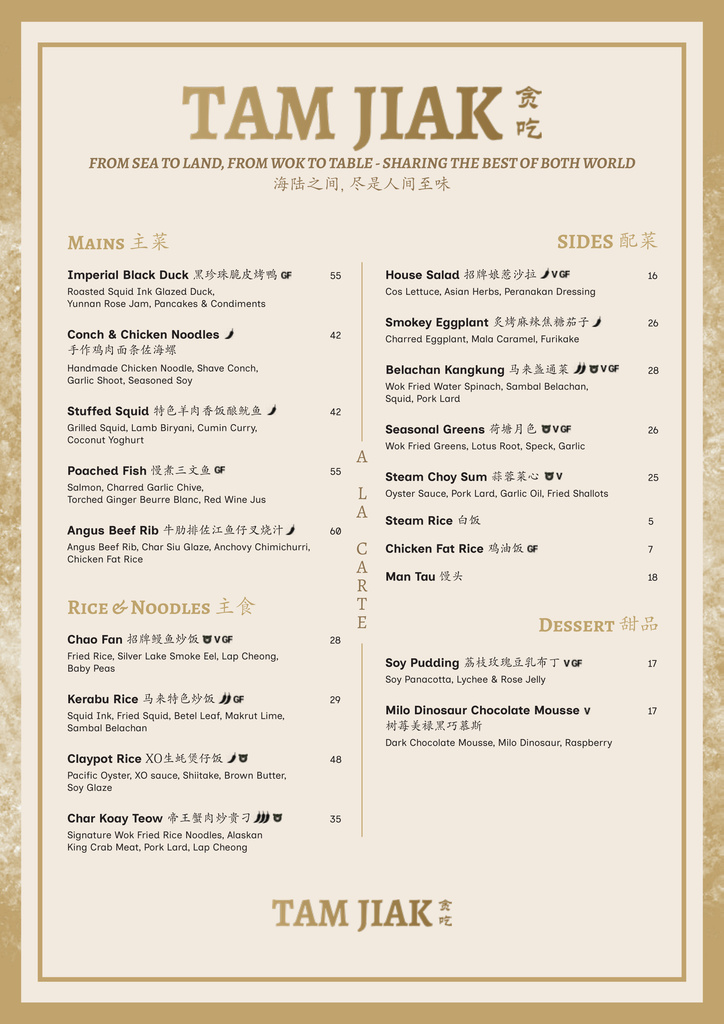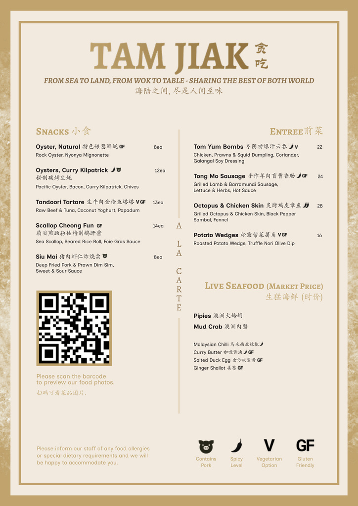 Authentic Malysian specials cooked by Jinda Khoo include Tom Yum Bombs, Curry Fitzpatrick Oysters, Scallops with Foie Gras, Angus Beef Rib with Char Siu Glaze, with  Anchovy Chimichurri, Mud Crab and much more!
