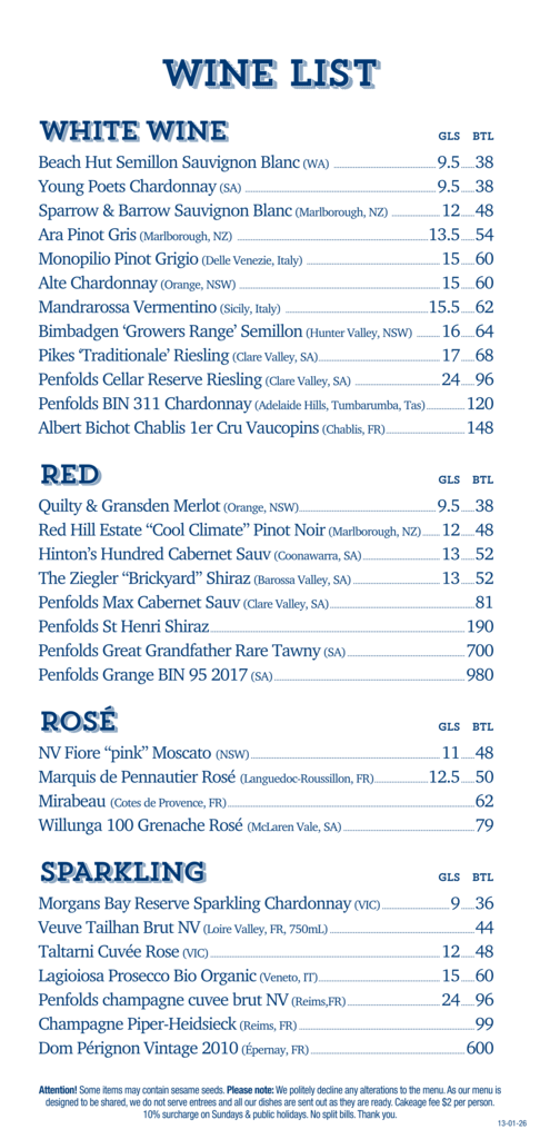 Beer on tap $10.00, byo  wine from Fishermans fine wine shop located at C7 before coming to the restaurant. Corkage $2.00