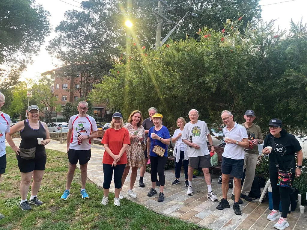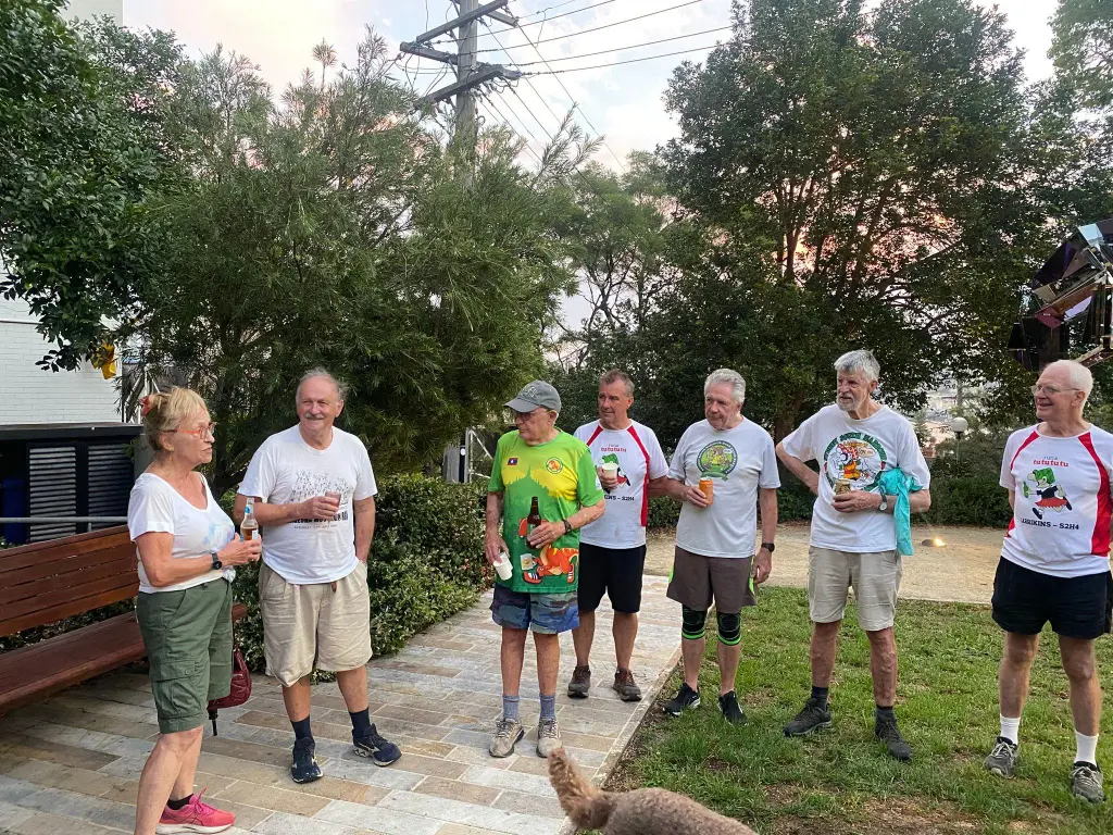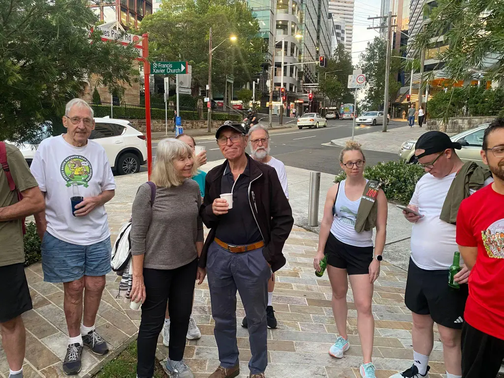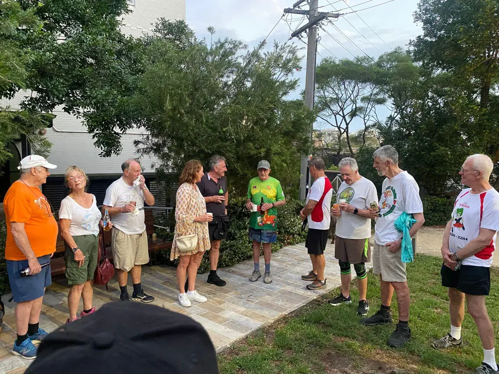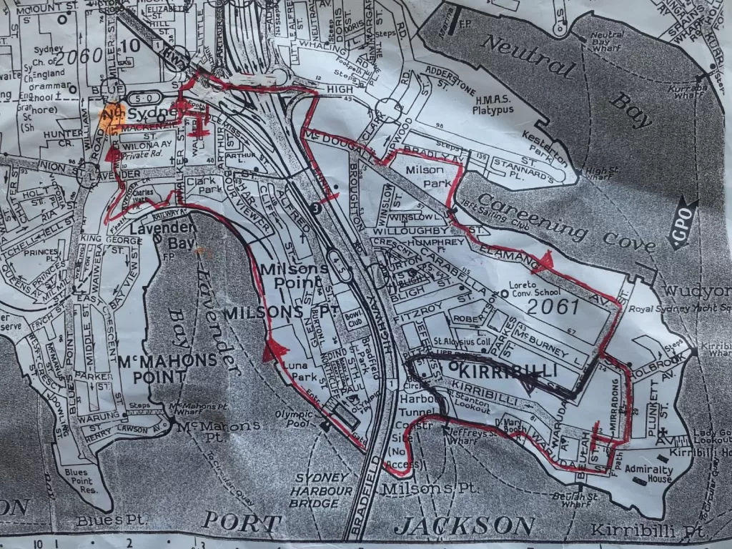 Setting the Larrikins run over the new Warringah Expressway bridge then around Milson Park came with the surprise of passing countless police lines near Admiralty House – all looking rather bored and waiting for action. The oddly dressed Hash Hare sporting daypack and scribbling large chalk arrows at their feet was not unnoticed. Pressing on regardless the brave Hash Hare continued marking arrows down through and past the police cordon until finally pursued by police. Explanations showing his run map caused great amusement.