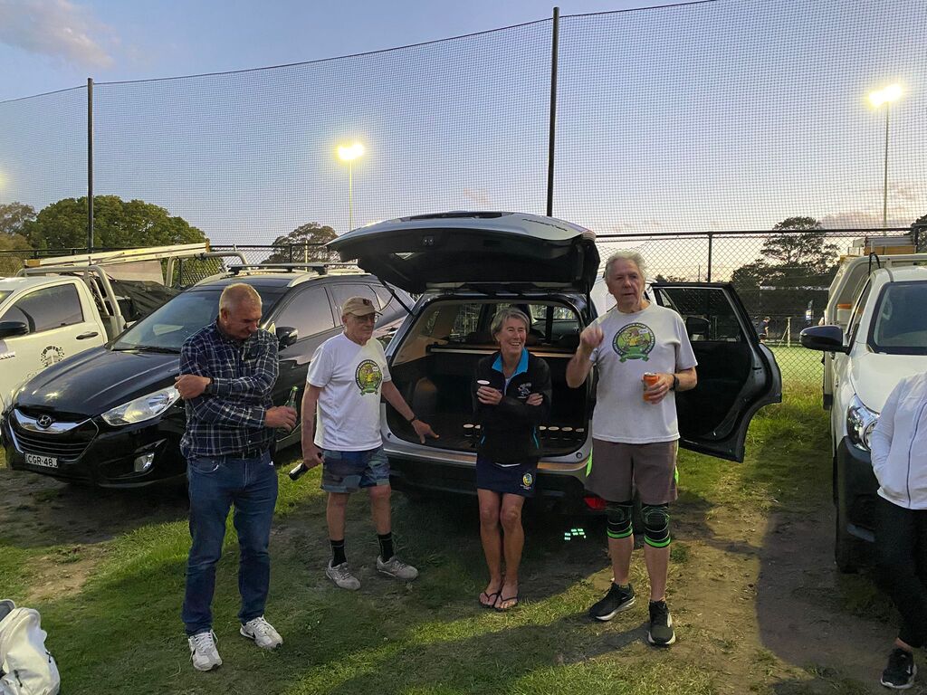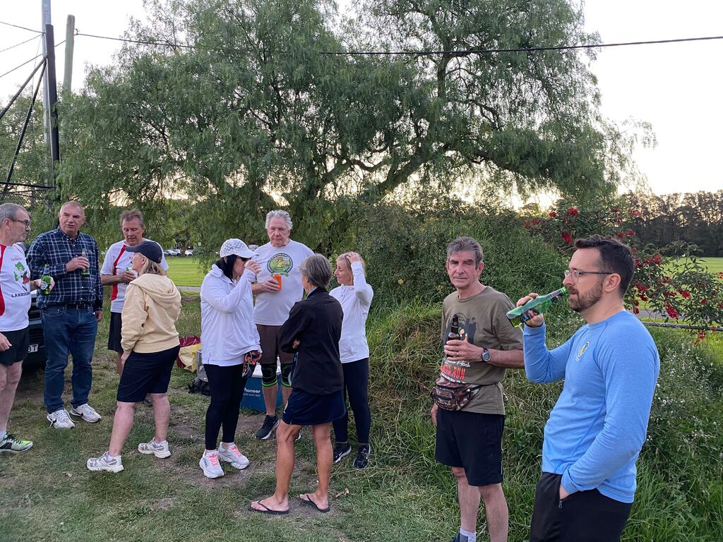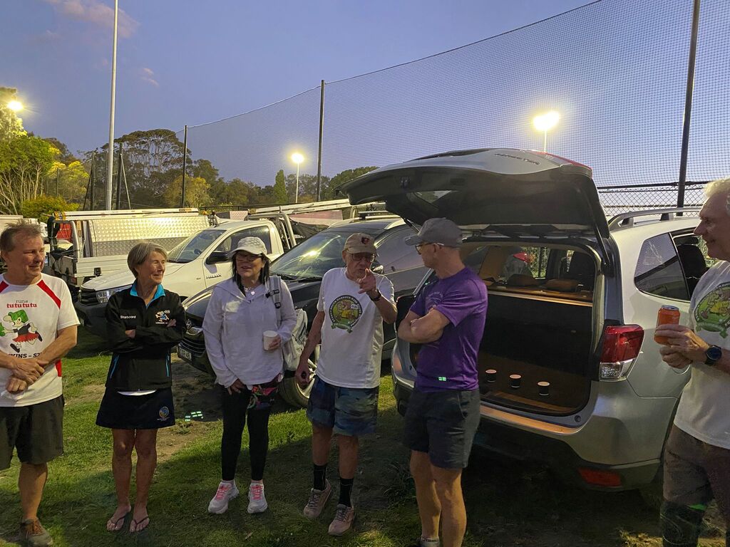 ‘Twas a warm and increasingly windy night – and that was before the food!! The unsealed car park behind the club soon became a dust bowl requiring a tactical relocation of the bucket upwind from the swirling sands. Luckily long time injured PHANTOM and newly blown up knee TWIN DICKS stayed behind to facilitate that , though TWIN DICKS insisted on not doing so till the first runner was sighted as it was clear PHANTOM was itching for an ale.