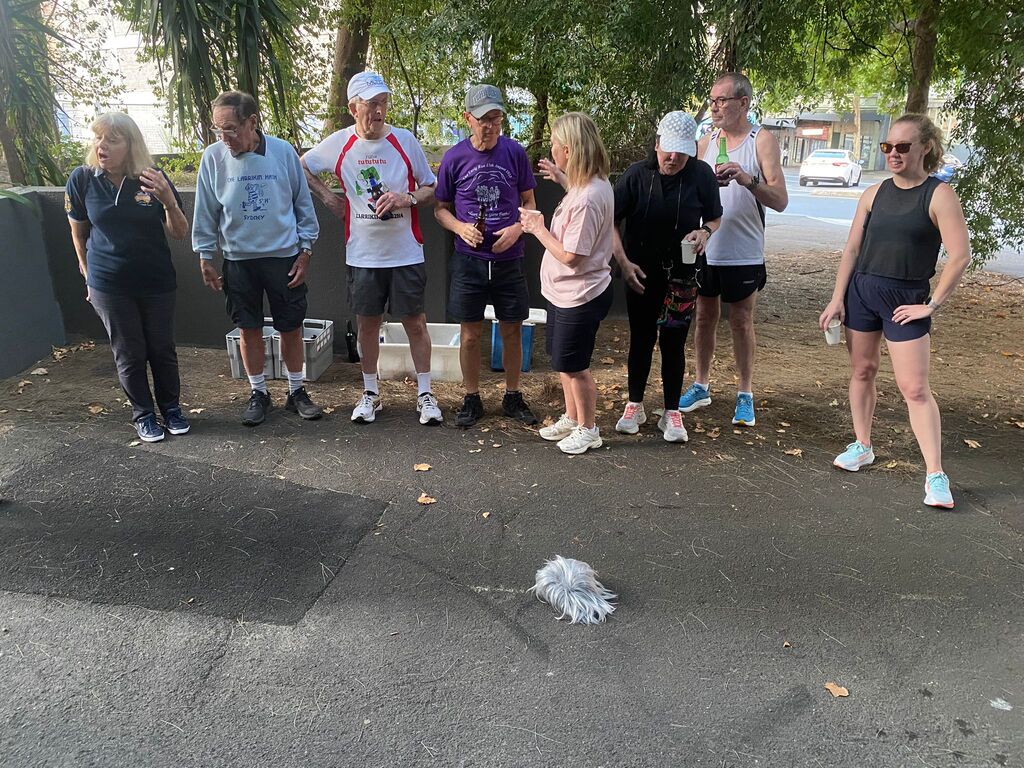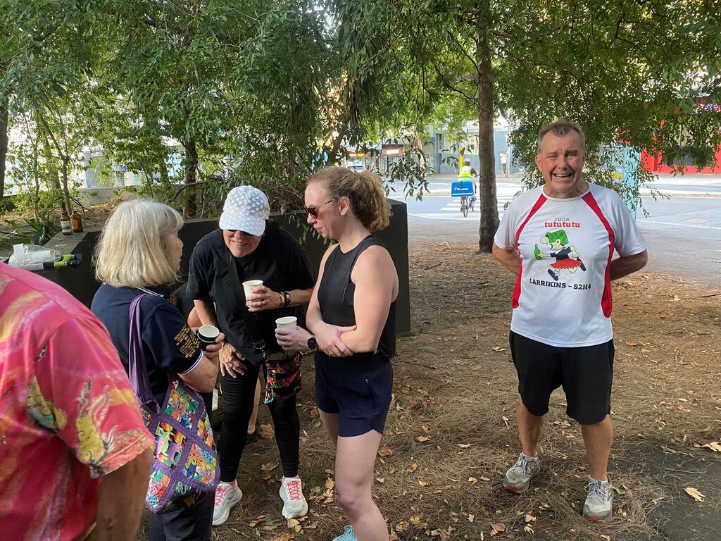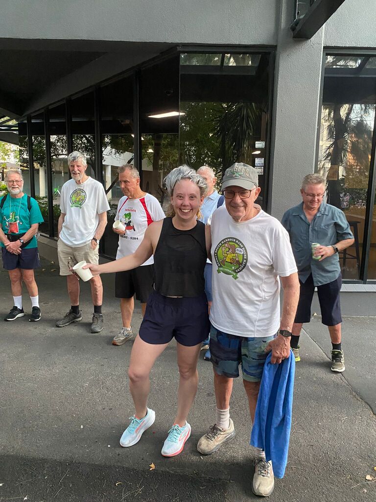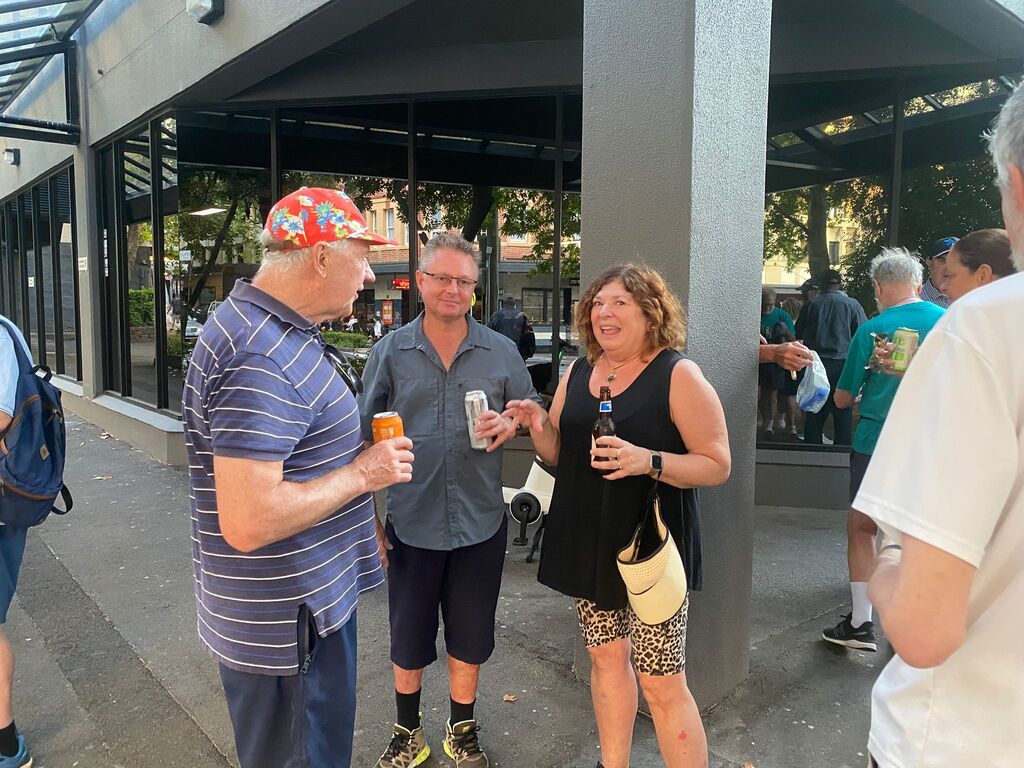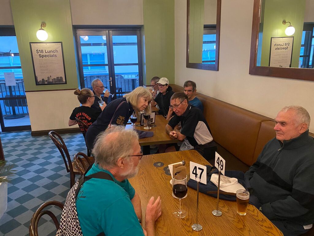 On a supposedly rainy day in January. I set off to set the run on what turned out to be a beautiful day with the help of Outer, who kindly offered to help me. We met at the Aurora pub & split up the run. Outer doing the first part &the walkers and I the runners section. So, armed with chalk and maps, we set off in opposite directions. And pretty much completed the run within an hour & a half, meeting up back at the pub. Had a couple of beers while we waited for the pack to turn up. One concern we had was parking for. Laundromat & the bucket so we endeavoured to reserve places with E bikes which worked to a degree except people keep coming and taking the base. Having done a quick check at the Aurora pub to make sure they had our bookings in place; we found out they hadn't. So, we made sure that they had got our special location ready for us at 8:00, which they did. Eventually the pack gathered at the back of Central Station on the corner of Elizabeth & Randall St. About 25 people turned up and they set off walking and running. While. Outer and I guarded the bucket. About an hour later, the first runners started coming back followed closely by the walkers. Plus, a number of hashers turned up. directly to the bucket, Cultured, Bristle & Bren Gun. Bristle having missed the run drinking in the wrong Pub. After some socialising around a bucket, Mongrel started the circle. Giving. I and. Outer down downs as joint hares. After run reports by Mother for the Walkers run. Where his only comment was “did you see the tallest wooden building in the world?” Nobody had, but we let that one pass, and he gave us a score of. 9.1. He'll do. Gave the run report. and also gave us a great score of 9.9 ( I believe). So, We drank our down downs quite happy with the results. It seemed that everyone thought the run was pretty well marked and pretty good for a run through the centre of the city. Also, a very rare an unusual event occurred. Mongrel. Instigating the naming of a new hash member under the age of 40. Unbelievable what's happening to the hash. The young lady is now known by the hash name of Swifty and is a very welcome addition to the group. Also given down downs that evening were Virgin hashes. Liz and Steve, who joined us for the first time. Plus, sometime visitors. Inner and Mrs AfterBirth were also given down downs for guest appearances at the run. I can't think. Of any other. Announcements except Bristle announced. Top shelf whiskey at the pub for $11.00 a shot. So, on that note, we all headed across the road to the pub. $18.00 burgers were the special, but people ordered quite a wide range of. meals. In general, didn't hear any complaints, food came fast. Pub was comfortable and they provided a good area for the pack. All in All, a good venue , one I think we would probably go back to in the future. Not a bad run even if I say so myself. On On Afterbirth